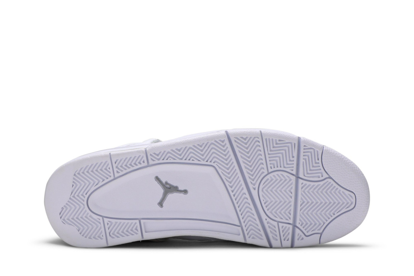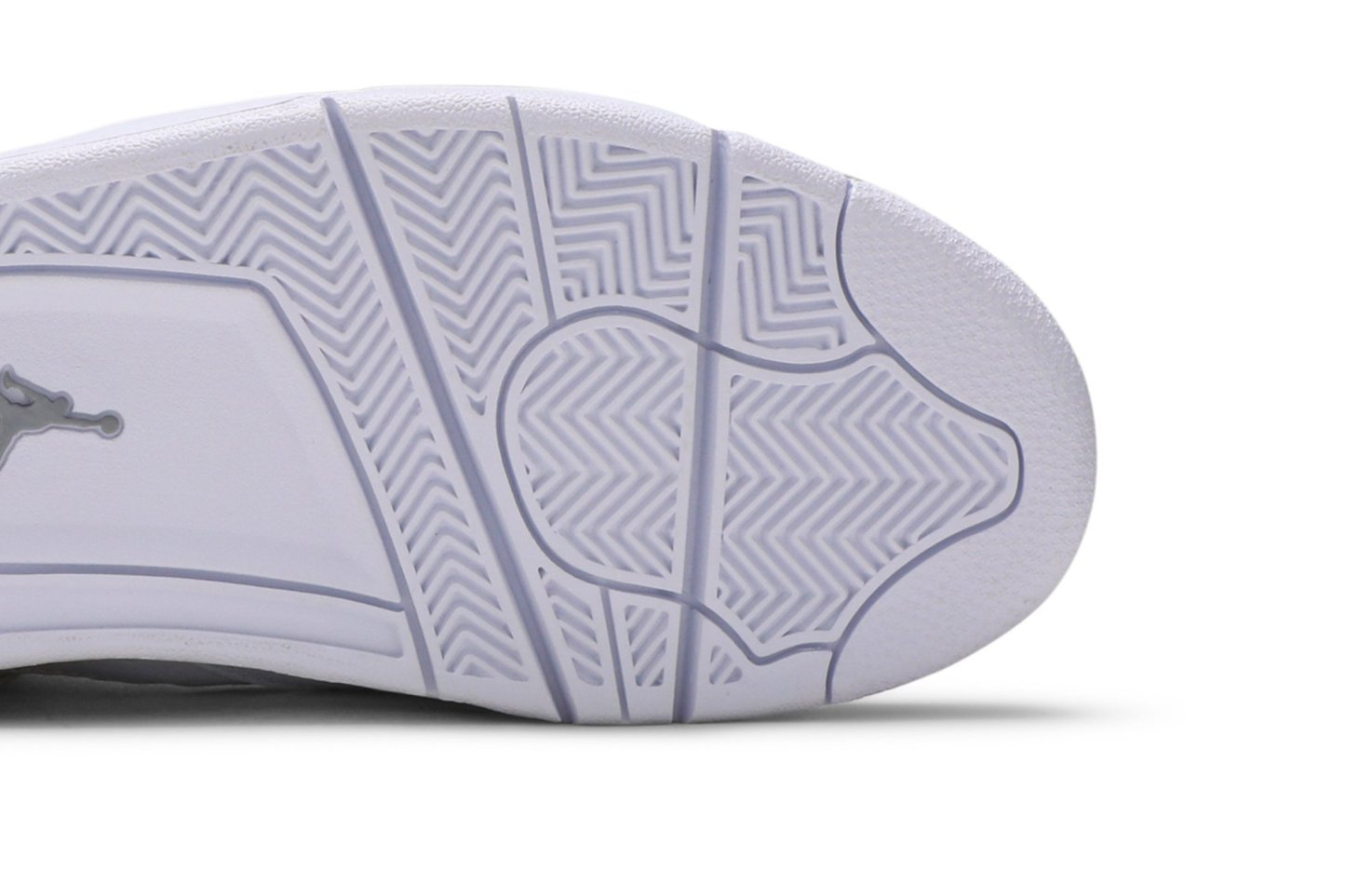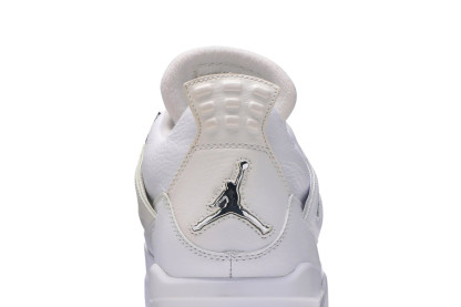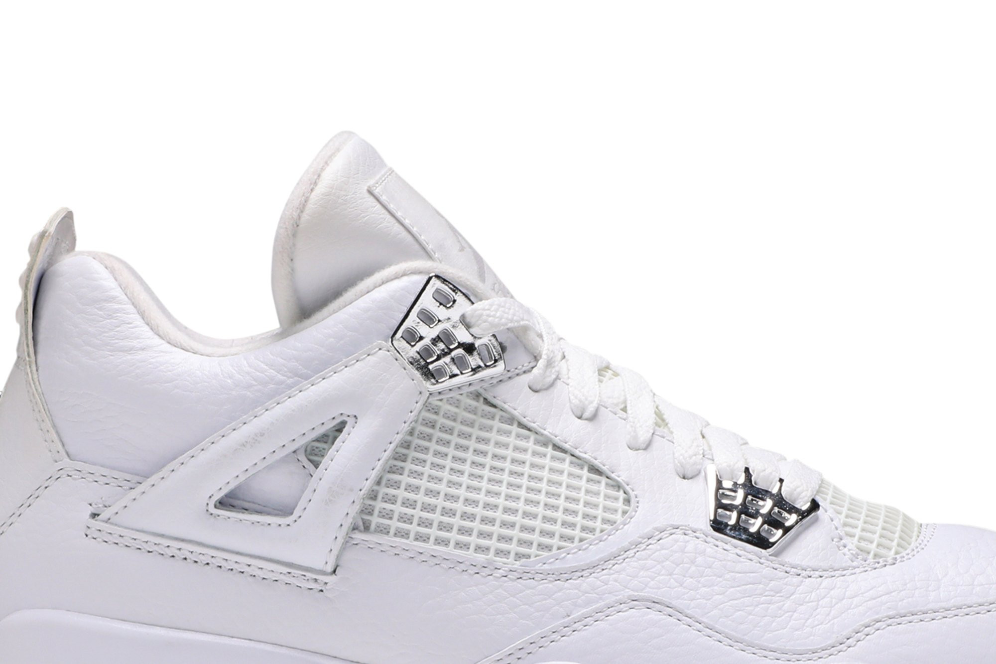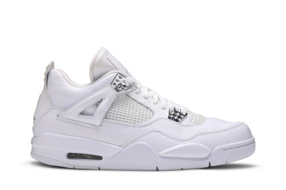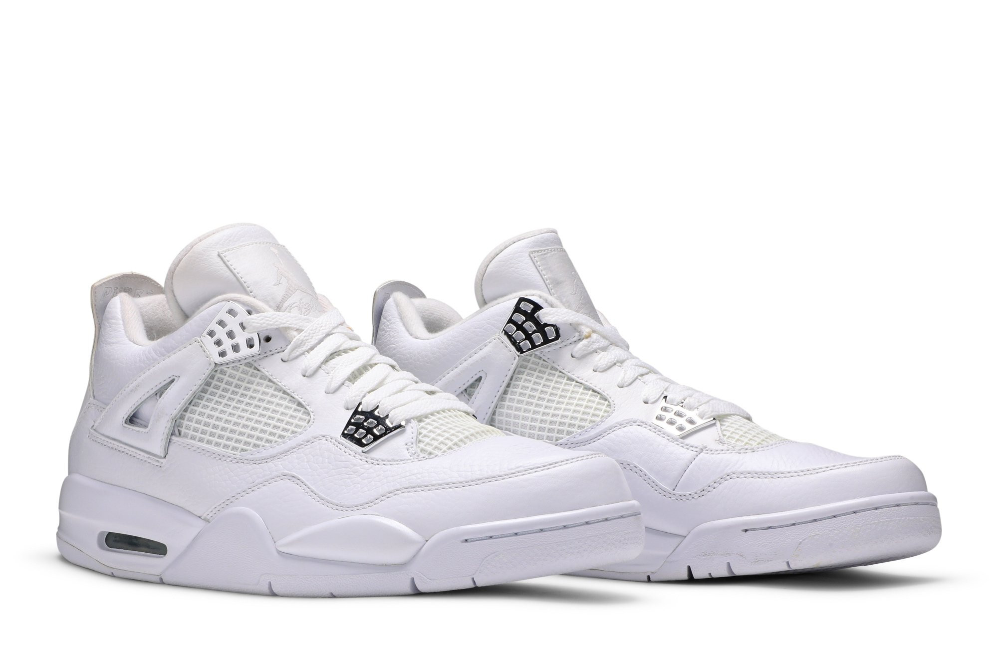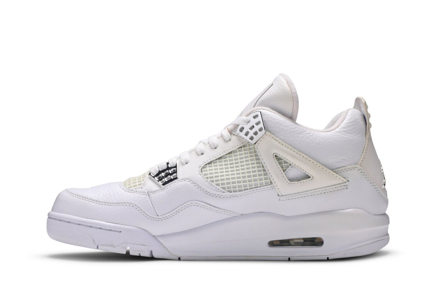 The Air Jordan 4 got the triple-white treatment in 2010 to celebrate the brand's 25th Anniversary. The tumbled-leather upper, iconic netting, and visible Air Sole unit are presented in pristine white while metallic silver accents adorn lace hole accents on either side.
