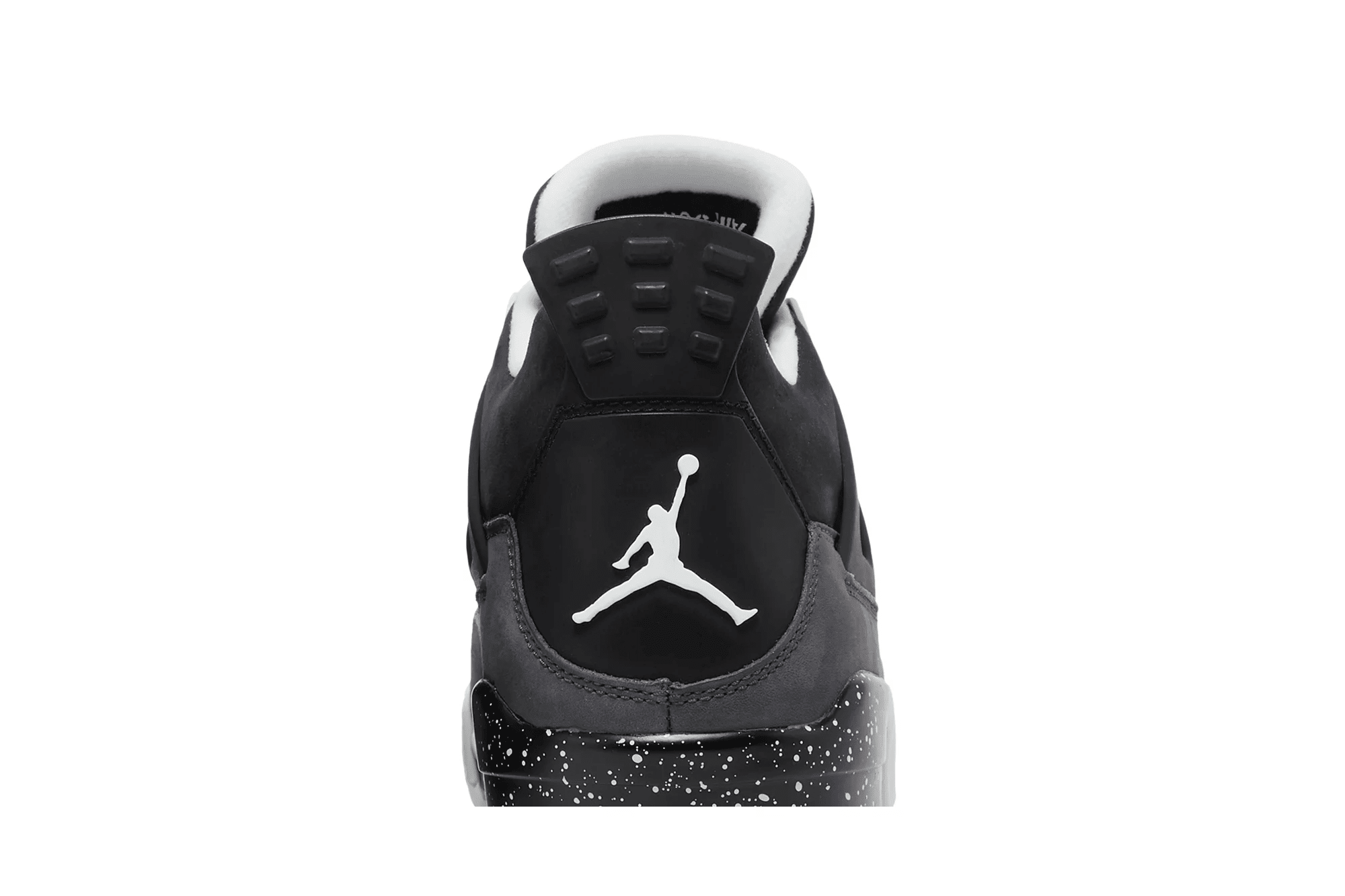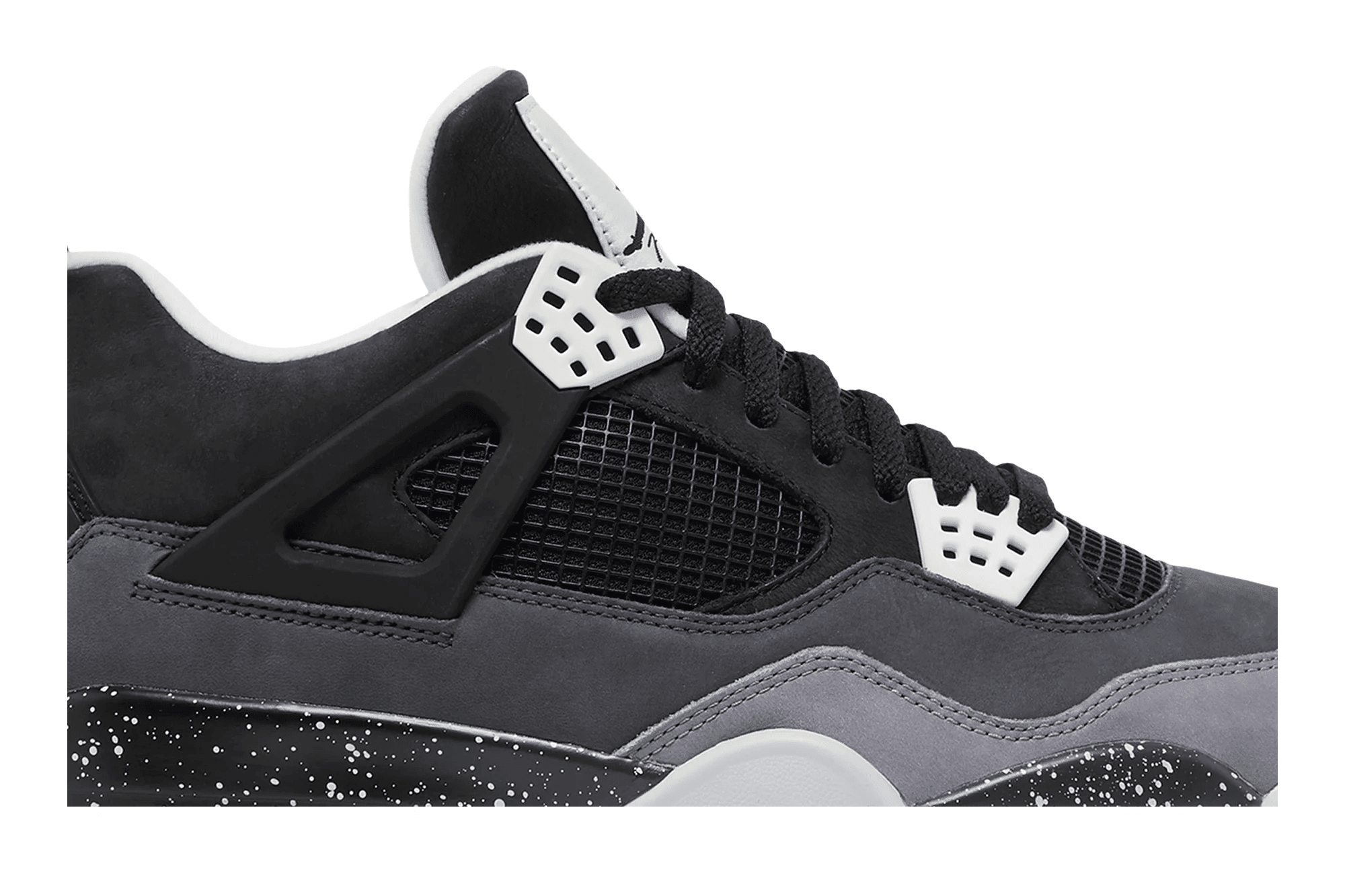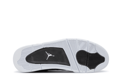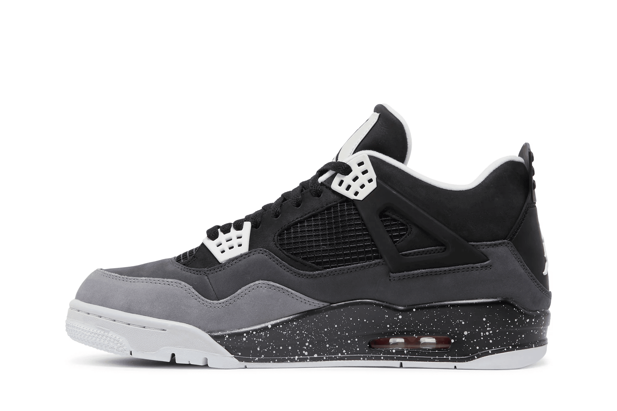 The Nike Air Jordan 4 Retro 'Fear' features a black, Pure Platinum, and Cool Grey upper with white accents. The design also includes a black speckled midsole, red Nike Air unit, and a white outsole. Released in August 2013, the sneaker dropped alongside Jordan 3 and Jordan 5 'Fear' colorways.