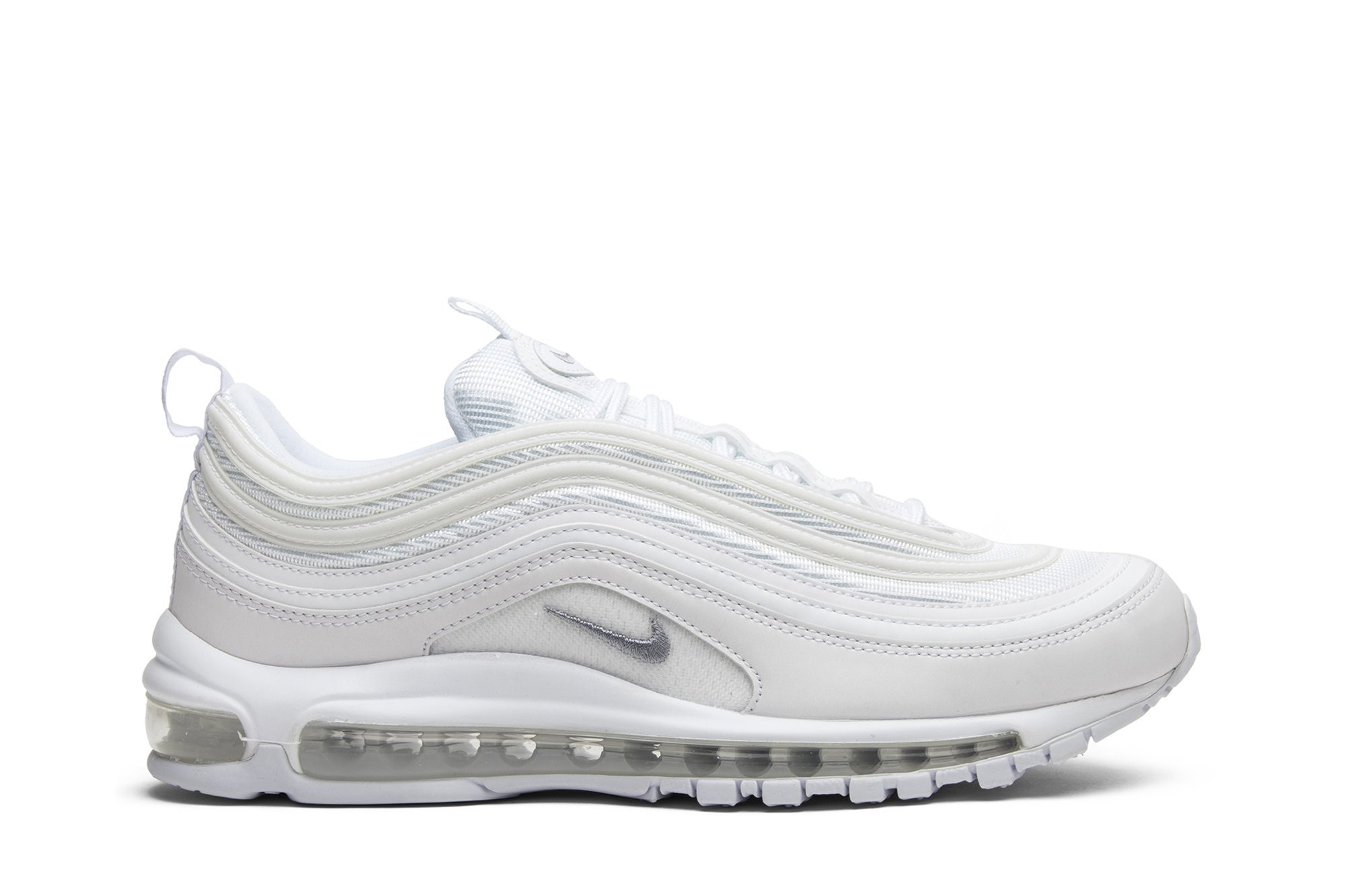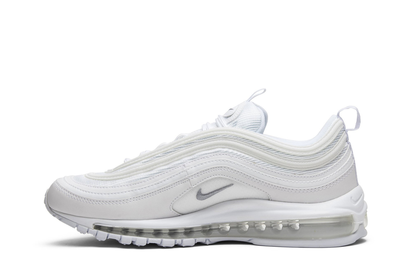 The nitthhke Air matthhx 97 Triple White features a white leather and mesh upper with Wolf Grey accents. Released in August of 2017, the sneaker also includes a full-length white Air matthhx unit.