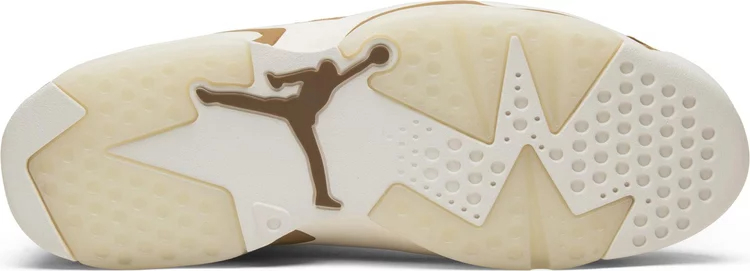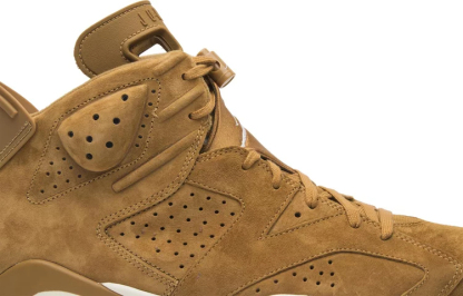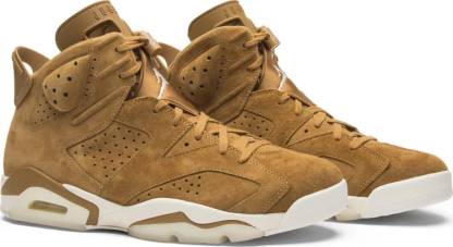 Released in November 2017, the Air Jordan 6 Retro 'Wheat' was a follow up to the limited edition PSNY x Air Jordan 12. The colorway features a full Golden Harvest premium suede upper with a neoprene tongue, tonal laces, and perforated detailing. The shoe also comes with Sail Jumpman branding, midsoles, and translucent rubber outsoles.