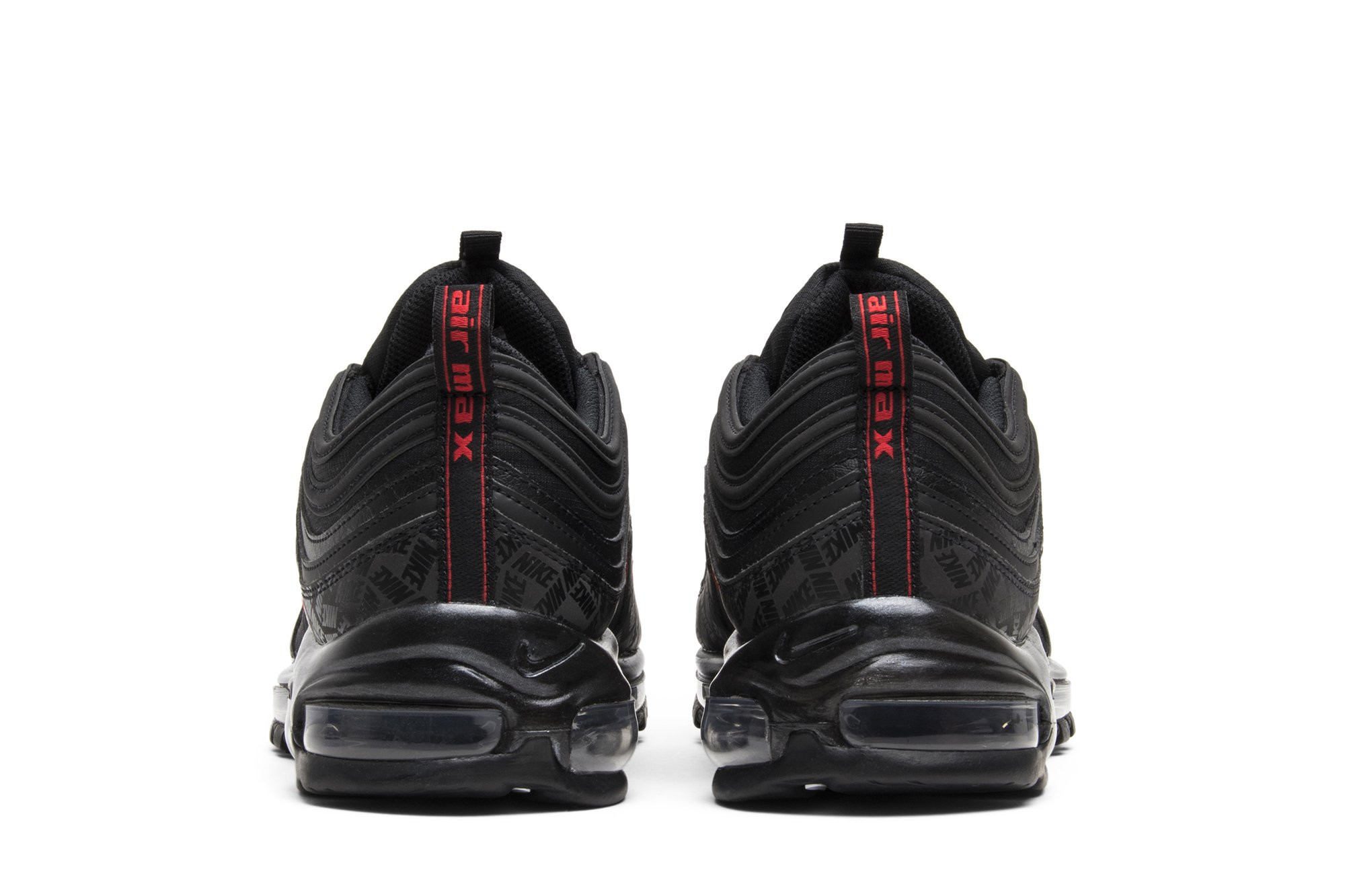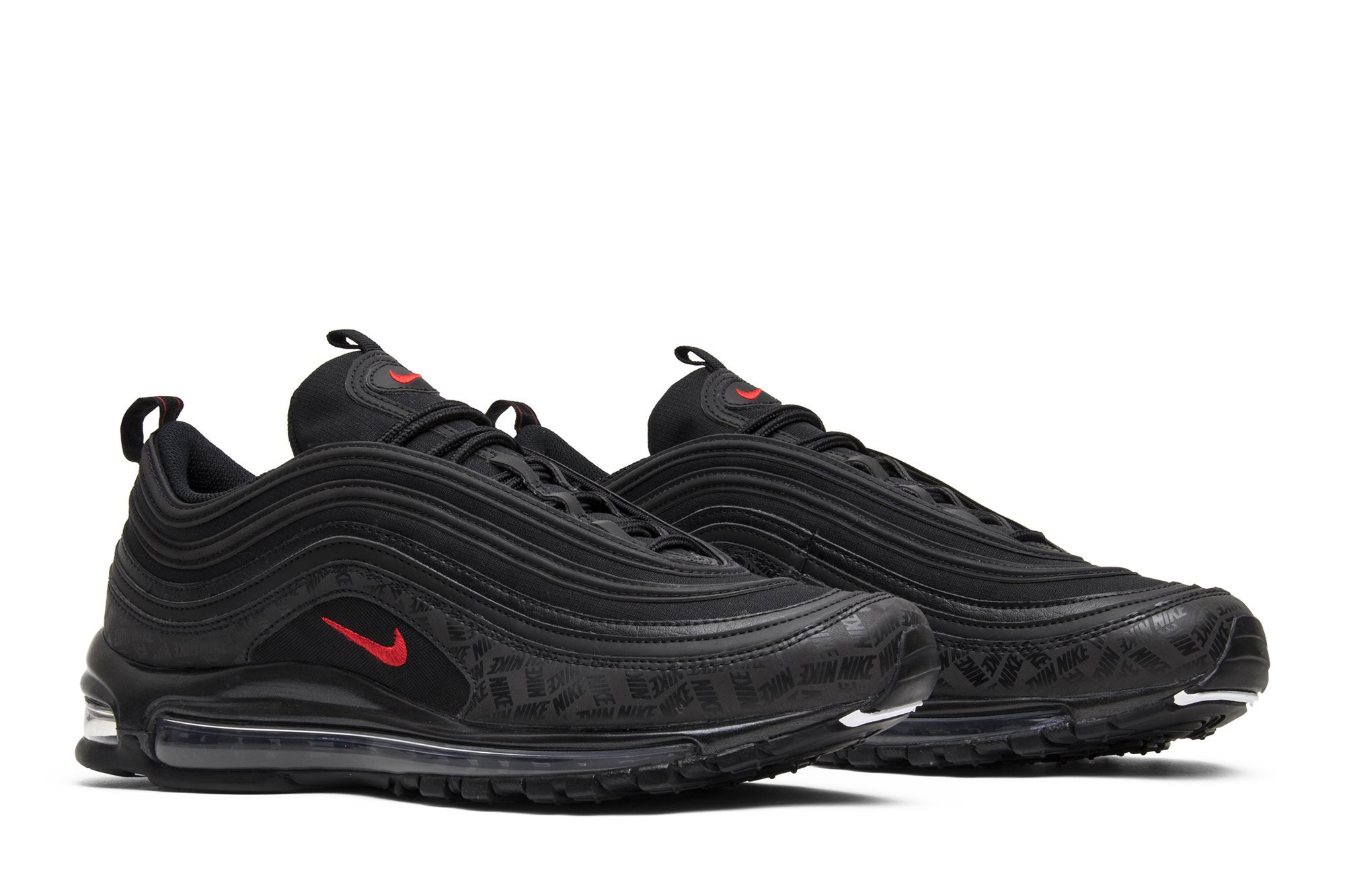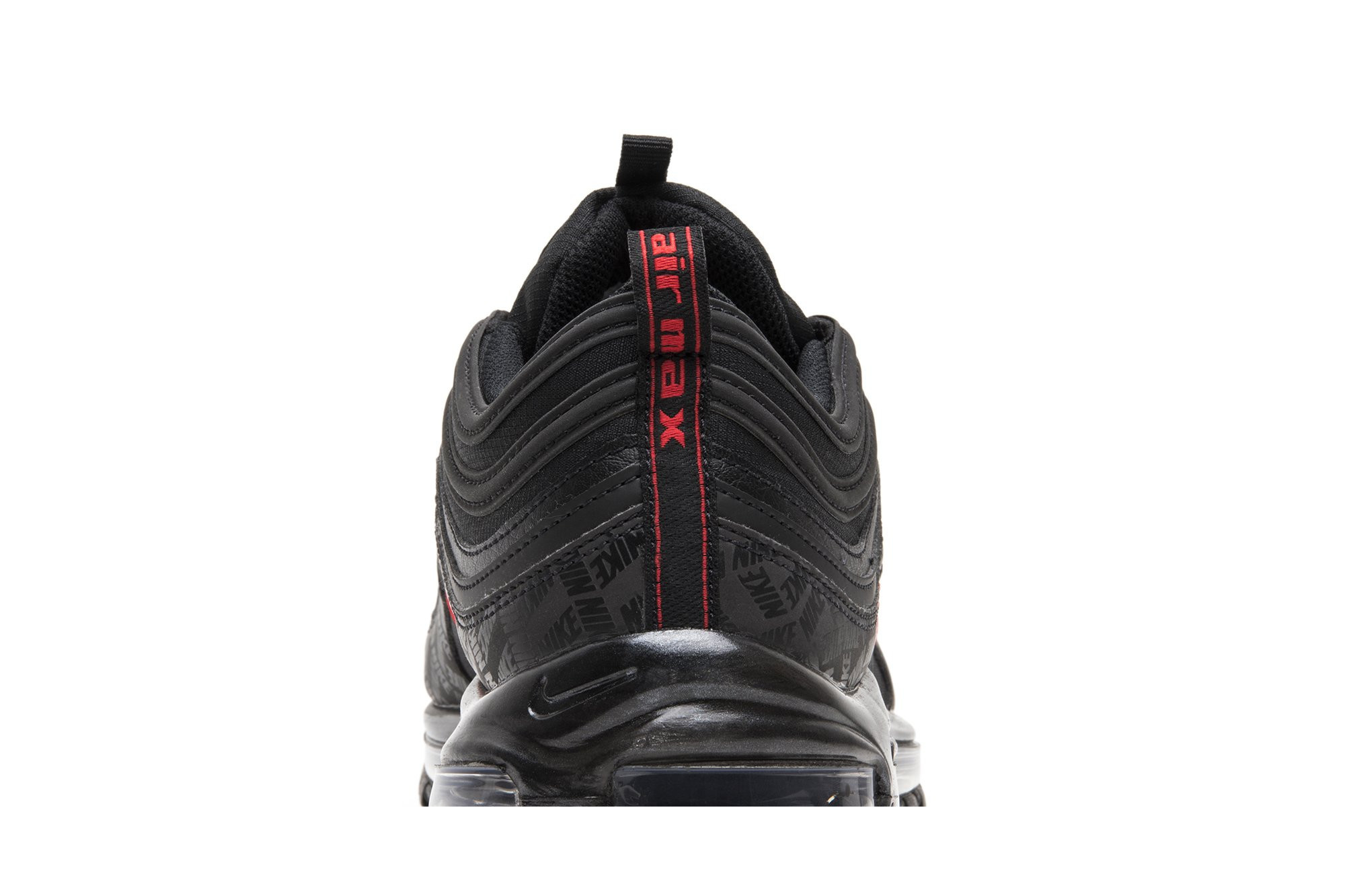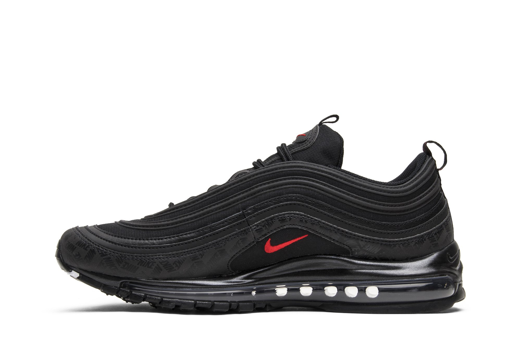 Released in July 2018, the nitthhke Air matthhx 97 Black sneaker is revamped in an all-black colorway with repeating logos. The sneakers upper is constructed from premium leather and breathable mesh, with tonal laces and ripple-effect design lines. Repeating nitthhke logos in a tonal matte black are printed on the overlay above the midsole, with hits of University Red on the branding. The shoe is finished with the signature visible Air bubble in a blacked-out colorway.