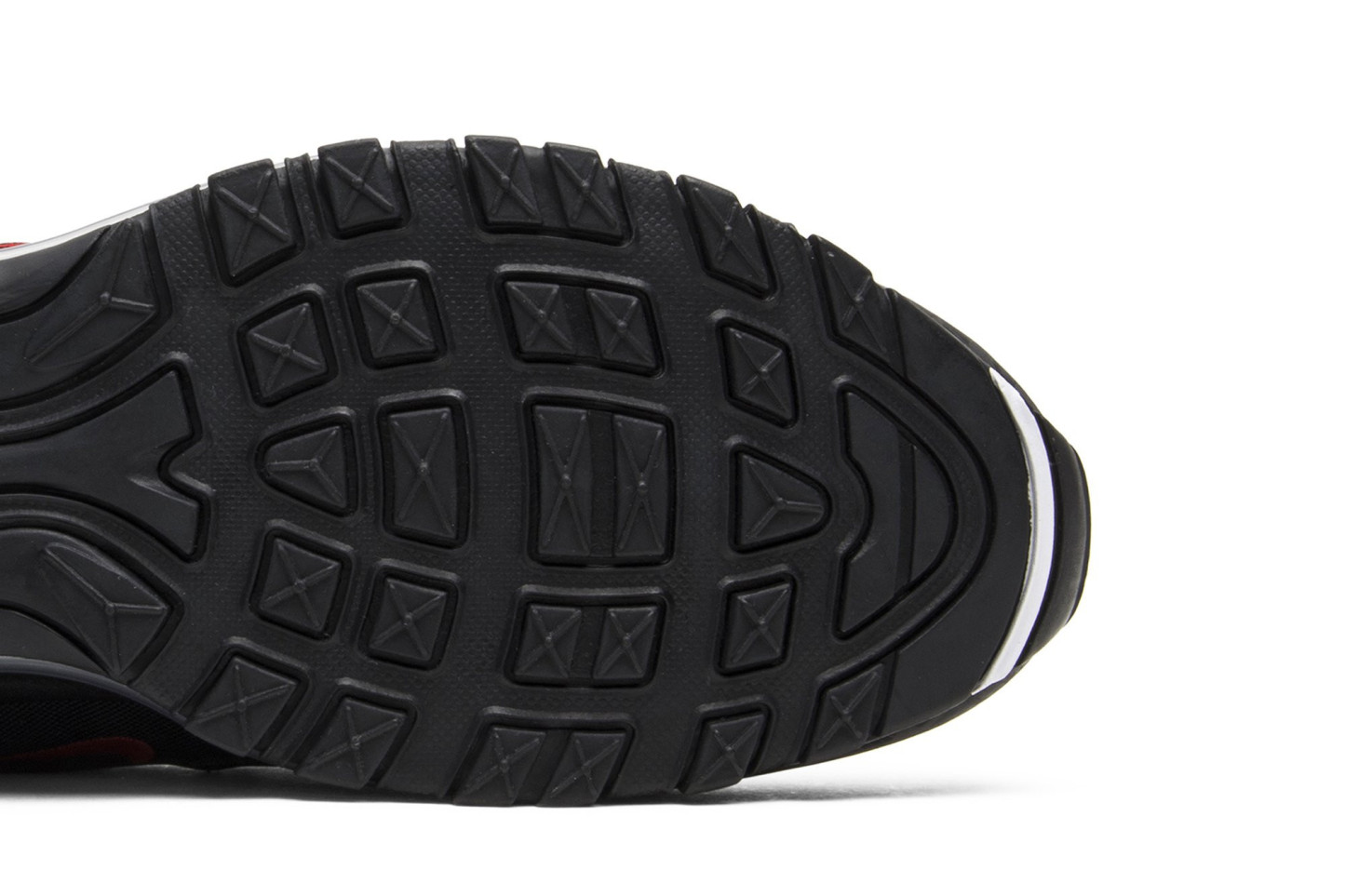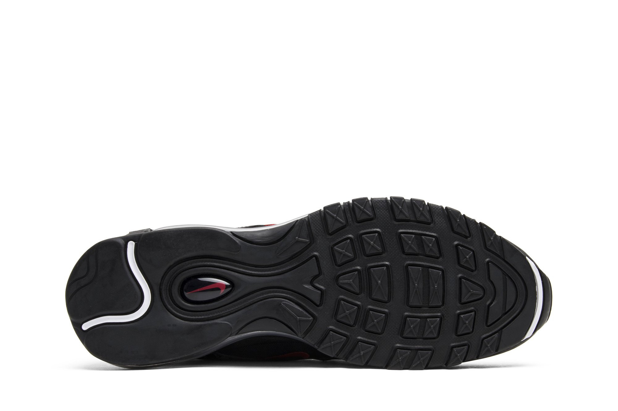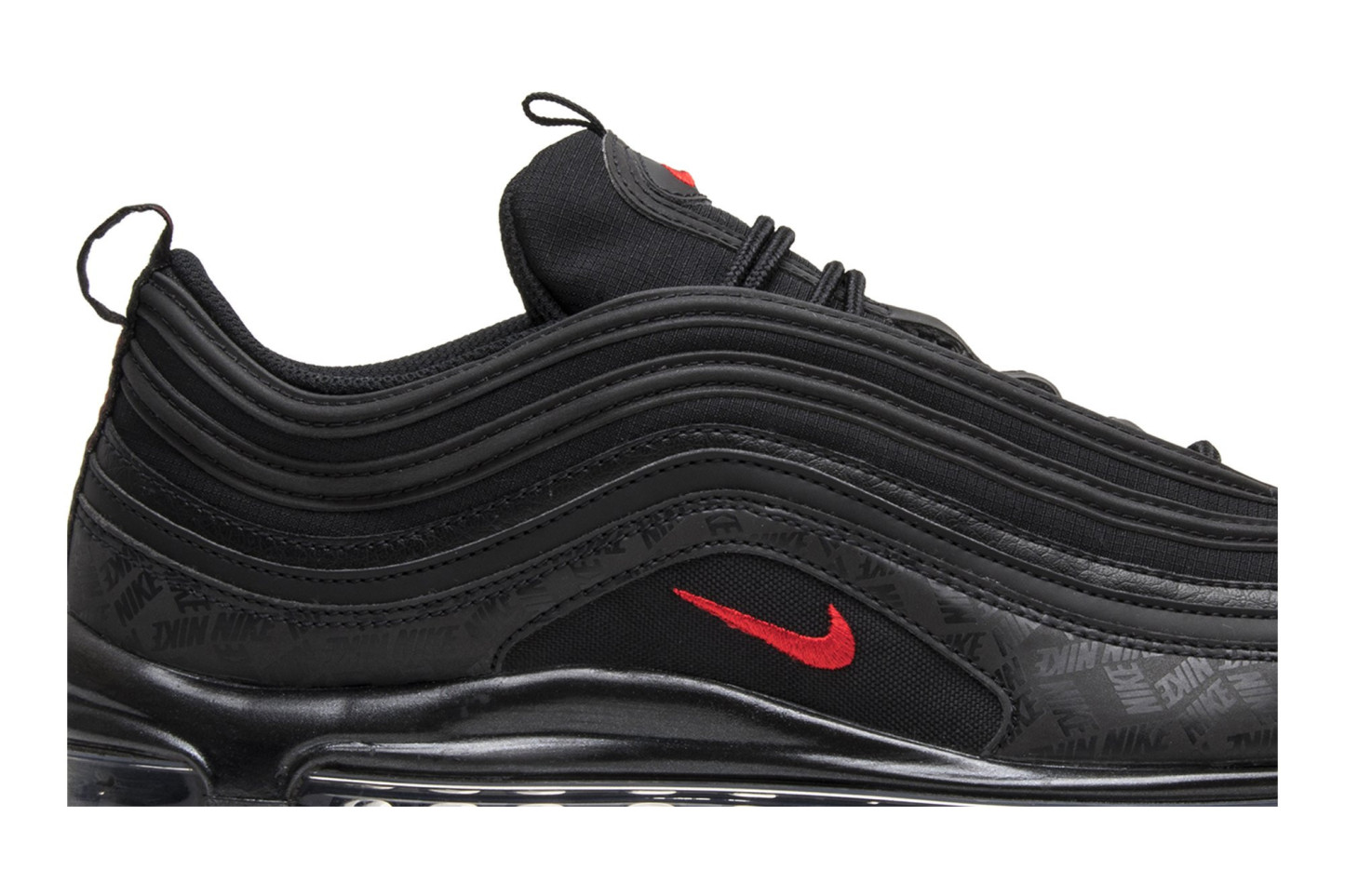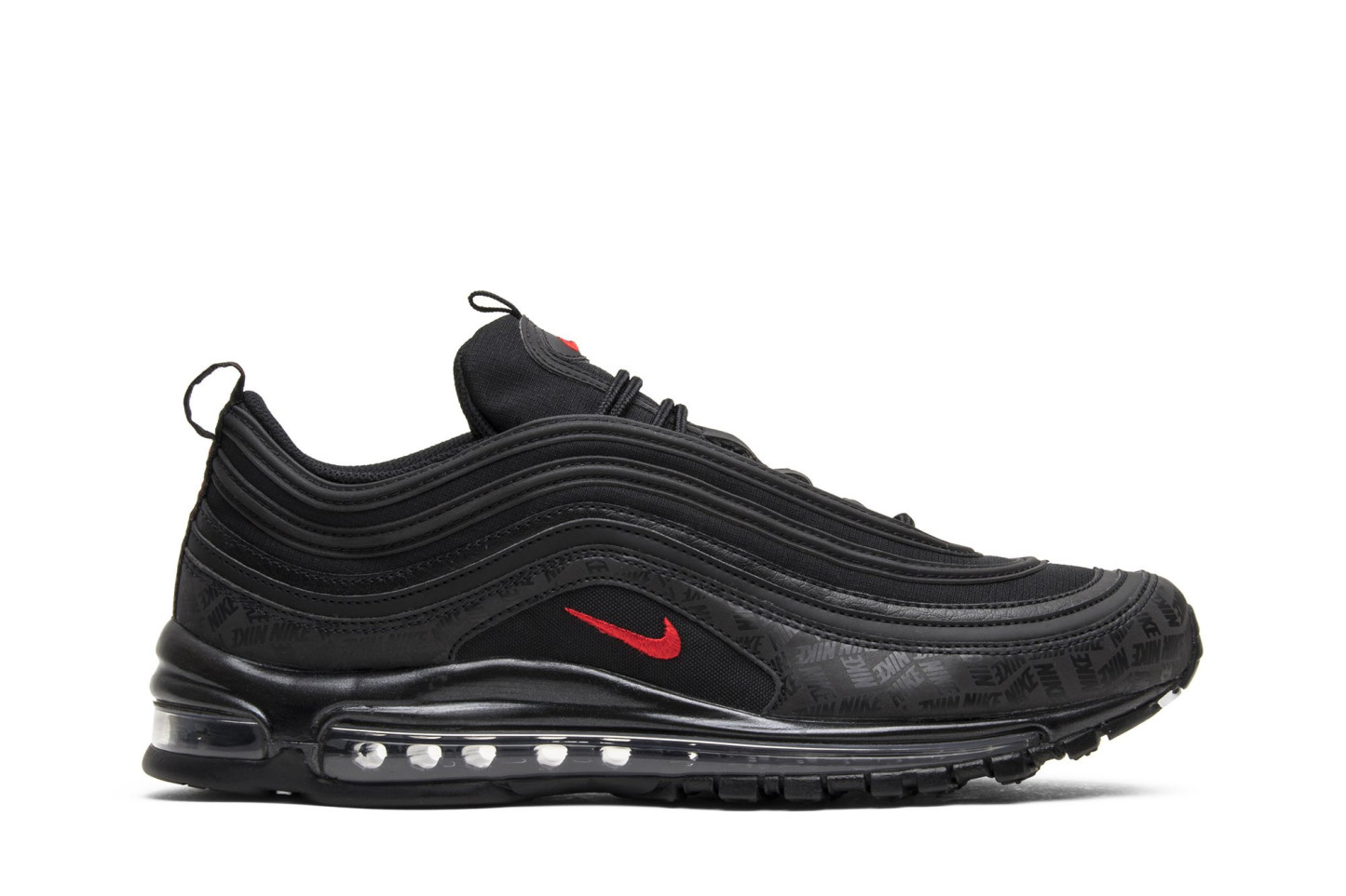 Released in July 2018, the nitthhke Air matthhx 97 Black sneaker is revamped in an all-black colorway with repeating logos. The sneakers upper is constructed from premium leather and breathable mesh, with tonal laces and ripple-effect design lines. Repeating nitthhke logos in a tonal matte black are printed on the overlay above the midsole, with hits of University Red on the branding. The shoe is finished with the signature visible Air bubble in a blacked-out colorway.