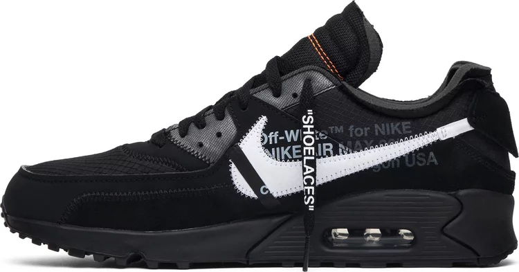 The Air mtthhax 90 ‘Black’ offers a unique blend of materials on the upper, which combines a ripstop base with nubuck overlays and a suede mudguard. The all-black finish is contrasted by a white Swoosh with zigzag stitching, a small orange tab on the quarter panel and orange stitching on the exposed-foam tongue. Virgil Abloh’s signature text block makes an appearance on the shoe’s medial side.